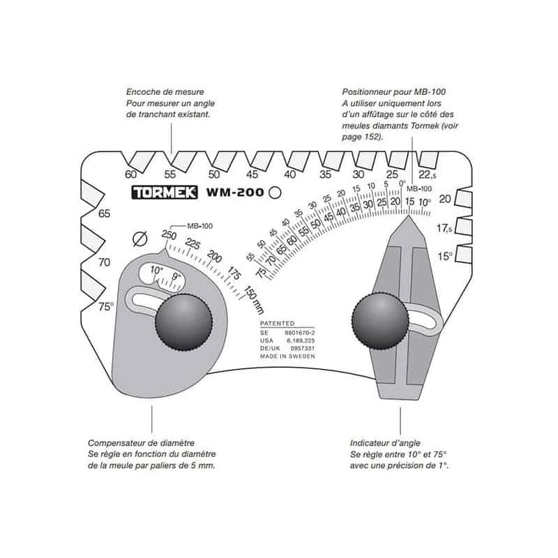 Ce positionneur d’angle WM200 Tormek breveté remplit deux fonctions : vous pouvez l’utiliser pour positionner un angle de biseau avant affûtage ou mesurer l’angle existant d’un outil donné.