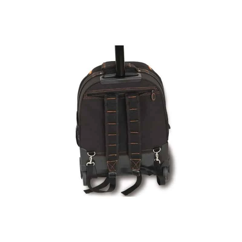 Livré avec composition de 35 outils 5915VU/0 avec poignée télescopique de transport Roues intégrées dans la structure avec protection anti-poussière, très pratique pour son utilisation sac à dos Deux panneaux porte-outils amovibles Cinq poches externes très pratiques Poche interne grande capacité pour ordinateur portable Base réalisée avec matériau résistant à l’eau