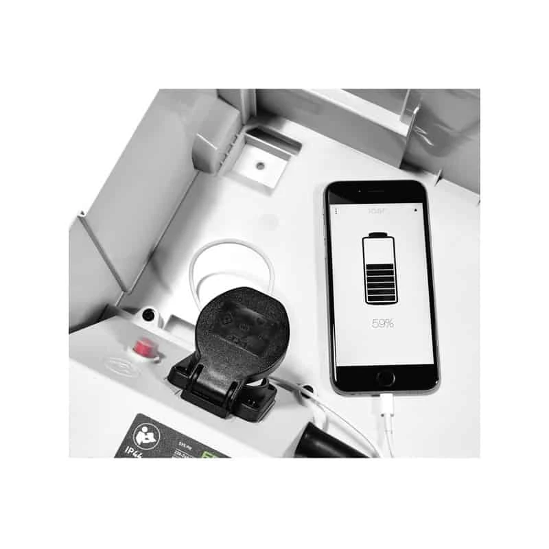 Alimente en courant jusqu’à quatre outils électroportatifs en parallèle, et si besoin est, un téléphone mobile ou une tablette peuvent être rechargés en plus à l’intérieur.