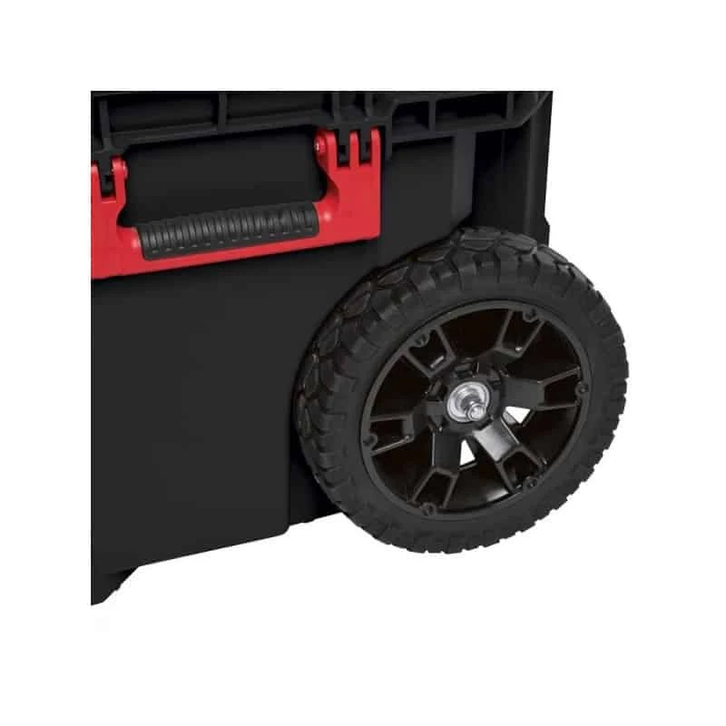 La conception robuste du coffre trolley Milwaukee PACKOUT offre une résistance extrême aux chocs grâce aux renforts d’angles métalliques et une capacité de charge maximale de 113 kg.