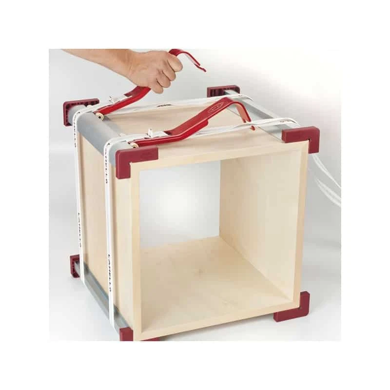 Système serre-joints pour corps de meubles, composé de profilés d’angles comme protection, de 2 sangles de 8 m de long et de 2 tenseurs.