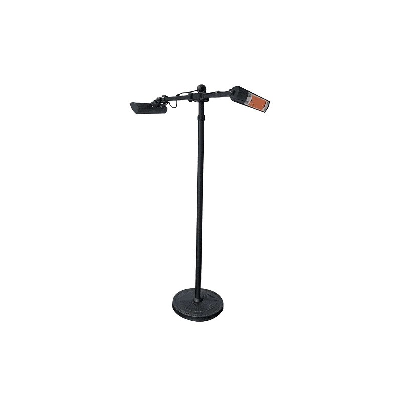 Lampe halogène, sur mât réglable de 199 à 218 cm, avec télécommande, 2 lampes indépendantes avec têtes inclinables (verticales ou horizontales) et orientables (côte à côte ou dos à dos).